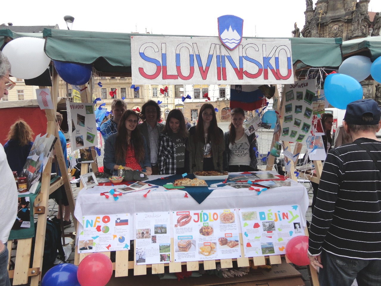 V úterý ráno se naše slovinská skupinka sešla v plném počtu na Horním náměstí a okamžitě zabrala jeden z mála volných stánků. Přípravy vypukly, nůžky stříhaly, lepidla lepily a nedočkavý důchodci pokukovali po našem, už téměř hotovém, stánku. Odhalili jsme svá kulinářská díla a mela mohla začít. Nikdy by mě nenapadlo, jak rychle jsou schopni kolemjdoucí spořádat téměř dvacetikilovou buchtu, která nakynula do monstrózních rozměrů. Jak se zdá, nic není nemožné. Následovalo mnou velmi obávané vystoupení. Ale řekněme, že na to, že jsme nacvičovali jednou, a to den před vystoupením, to nedopadlo až tak zle. Jedno vím však jistě, herečka ze mě nikdy nebude. No a co bylo dál? Kochání se ostatními stánky, sledování prezentací a užívání si skvělé atmosféry.