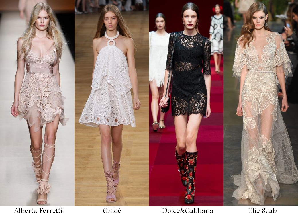 Jeden z nejčastějších materiálů, který návrháři na modelech použili. Připravte se na romantické šaty převážně z bílé krajky. Právě takové šaty dominovaly na molech většiny přehlídek.