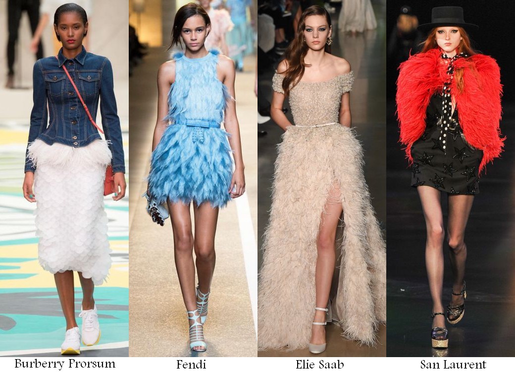 Jemná peříčka nebudou součástí pouze společenských oděvů, ale dostanou se i na běžně nošené modely. Přinesou do šatníku lehký glamour a luxus. Peříčky budou lemované bundy, šaty i drobné doplňky. Zvláště Karl Lagerfeld, navrhující pro značku Fendi, si s tímto prvkem pohrál na svých modelech šatů, které vypadají jako poseté peřím exotických ptáků.