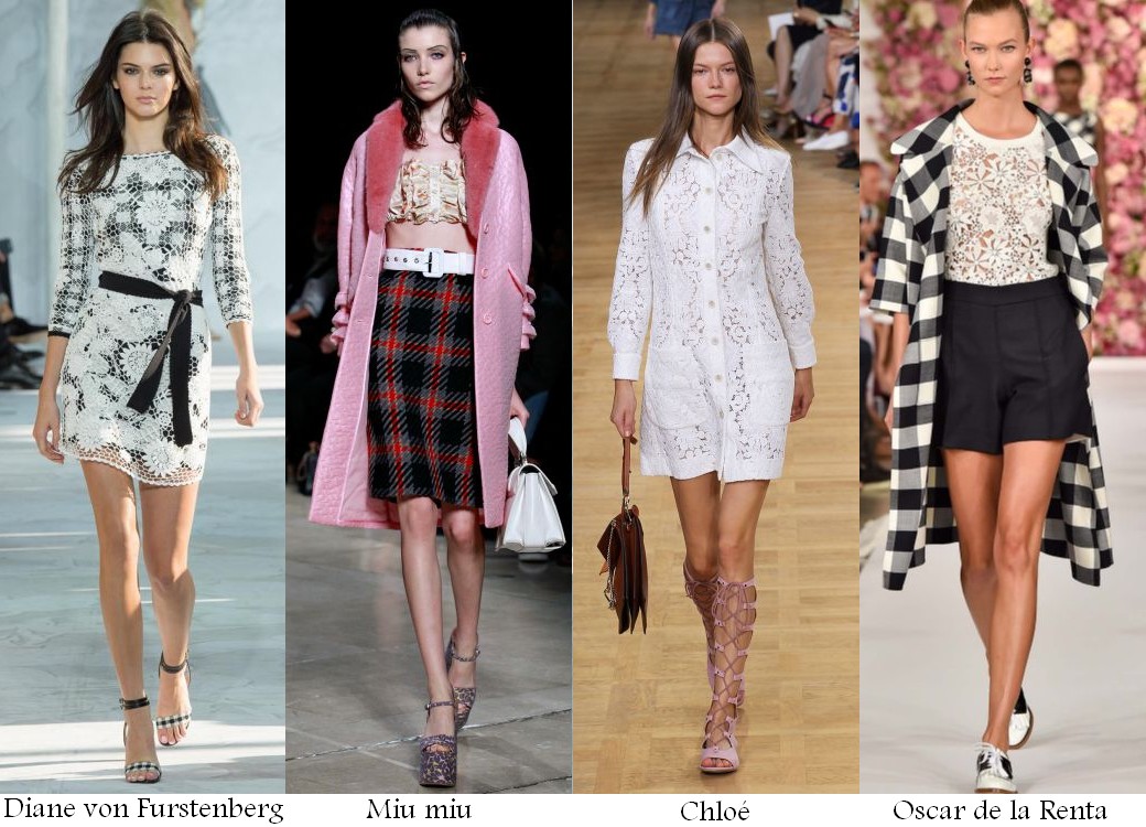 Můžete samozřejmě kombinovat i více trendů najednou. Jako například můj oblíbený model, který na sobě prezentovala modelka Kendall Jenner od návrhářky Diane von Furstenberg (vlevo). Tyto černobílé šaty mají jak kostkovaný vzor, tak krajku. Jsou navíc přepásané látkovým páskem, který bude letos také velmi aktuální. Vše je jenom na vás. Na módě je nejhezčí kreativita, se kterou můžete pracovat.